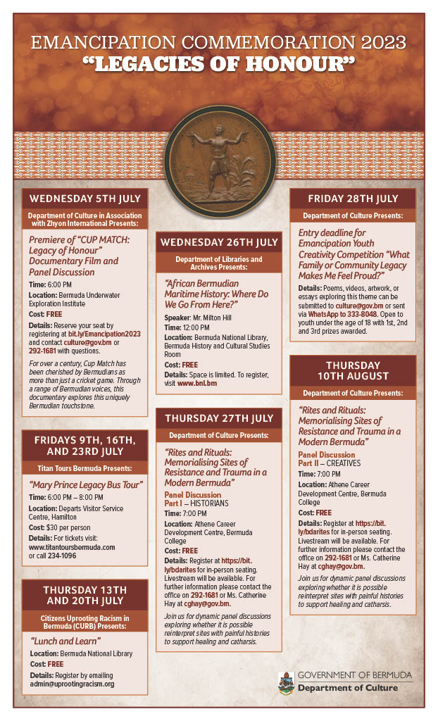 Madam President, The Department of Culture will close out the month with a two-part lecture series as part of the Bermudian Heartbeats programme, entitled “Rites and Rituals: Memorialising Sites of Resistance and Trauma in a Modern Bermuda”. Information on these programmes as well as previous years’ research conducted by the Department of Culture can be found on www.emancipationbermuda.com.