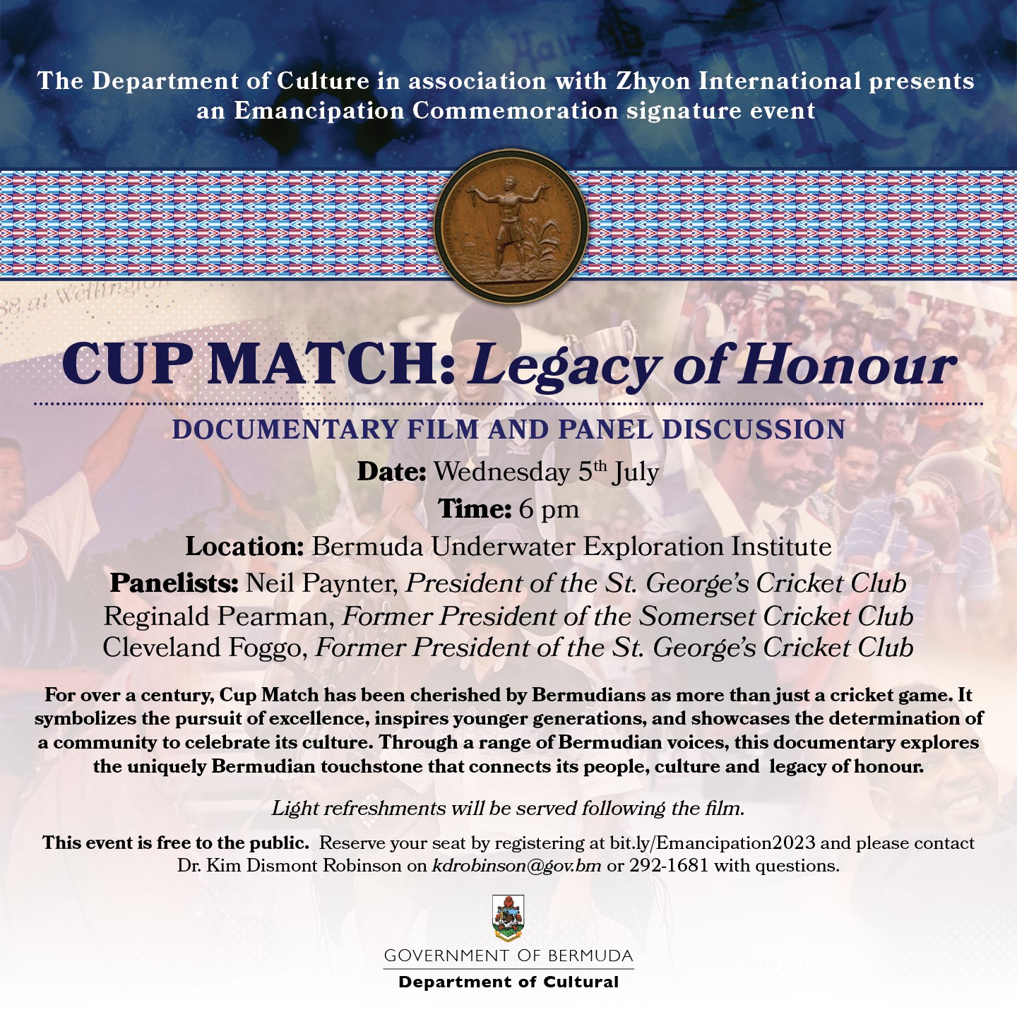 In recognition of Emancipation, the Department of Culture is pleased to present the documentary film screening of Cup Match: Legacy of Honour, July 5th, at the Bermuda Underwater Exploration Institute (BUEI).