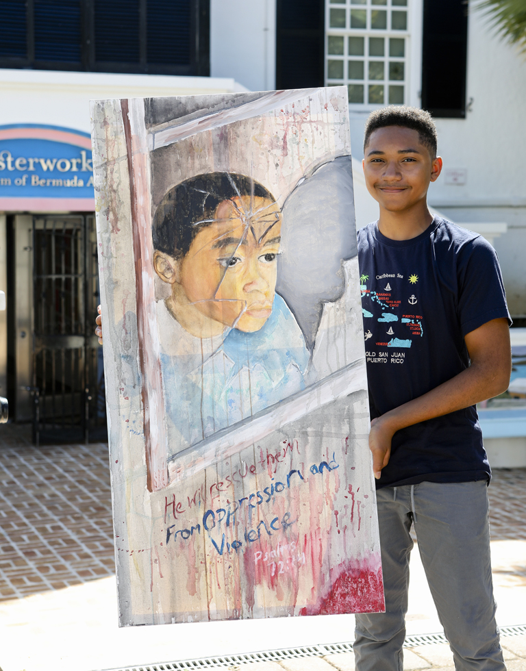 I would like to congratulate Austin Dowling’s work “He Will Rescue Them,” a haunting painting of a boy gazing through smashed glass, won the overall prize of $2,000. Further winners included, Keino Lambert winning for Best Traditional Painting, Je-Shae Pace for Best Mixed Media piece, Legend Stevenson for Best Digital piece, Best Student 16 and Under was won by MSA student Kelsey DeSilva, and Student 12 and Under was won by Eshe Holdipp-Lynch of West Pembroke School. Alshante Foggo took home the People’s Choice award for her piece, “I Trigger Love”.