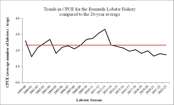 Since 2016, there has been a notable reduction in the average number of lobsters caught per trap, referred to as catch per unit effort (CPUE). This statistic is used to evaluate the status of fisheries worldwide because it is less affected by the number of vessels fishing or the number of traps they possess, as both may vary over time. The long-term average CPUE for Bermuda's commercial spiny lobster fishery, based on 20 years of data, is 2.33 lobsters per trap. However, the CPUE has been consistently below this value for the past seven seasons. Although the differences might seem small, across the thousands of traps hauled, this amounts to a significant decrease in the total catch.