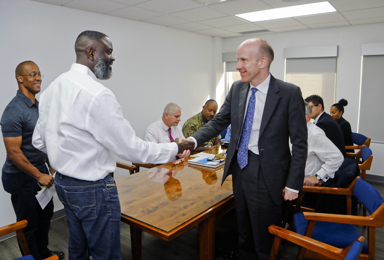 Earlier today, the Minister of National Security, the Hon. Wayne Caines JP, MP, welcomed Governor John Rankin and the Director of Overseas Territories Mr. Ben Merrick to the Ministry Offices.