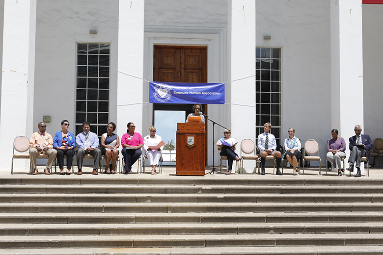 The Minister read the proclamation from the steps of City Hall this afternoon, accompanied by members of the Bermuda Nurses Association Executive Committee, the City of Hamilton Councillor Henry Ming and the Director of the Department of Health David Kendell.