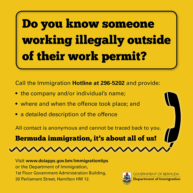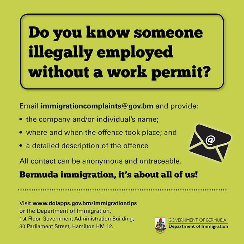 “We cannot stress enough the need for the public’s involvement in this process. We are asking all residents, if you know of an individual or company in violation of an immigration law, please report it. We also want to take this opportunity to remind both Bermudians and foreign nationals here illegally that there is zero tolerance for this type of behaviour. Persons found engaging in such activity will be prosecuted as these are serious offences which we will not ignore.”