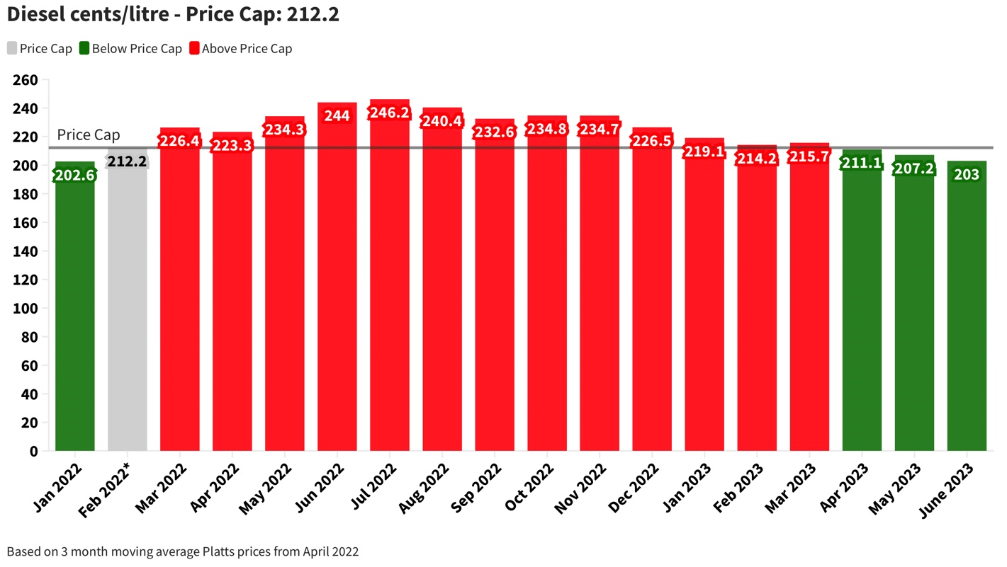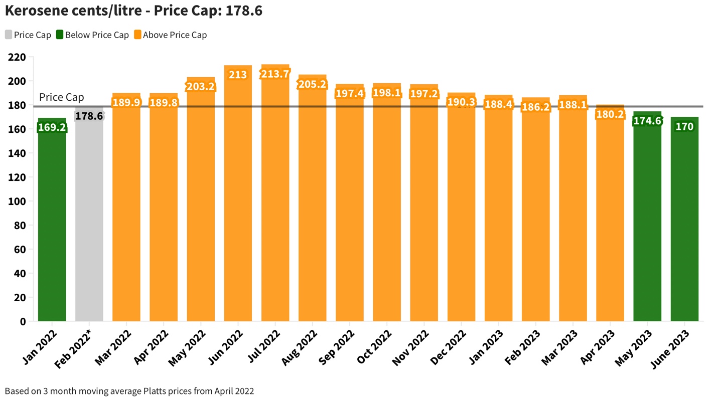 “Diesel, for the third consecutive month, is below its price cap of 212.2 cents/litre and will be 203.0 cent/litre, 4.2 cents/litre lower than last month. For the second time, Kerosene is below its price cap of 178.6 cents/litre and will now be 170.0 cents/litre, 4.6 cents/litre lower than last month.