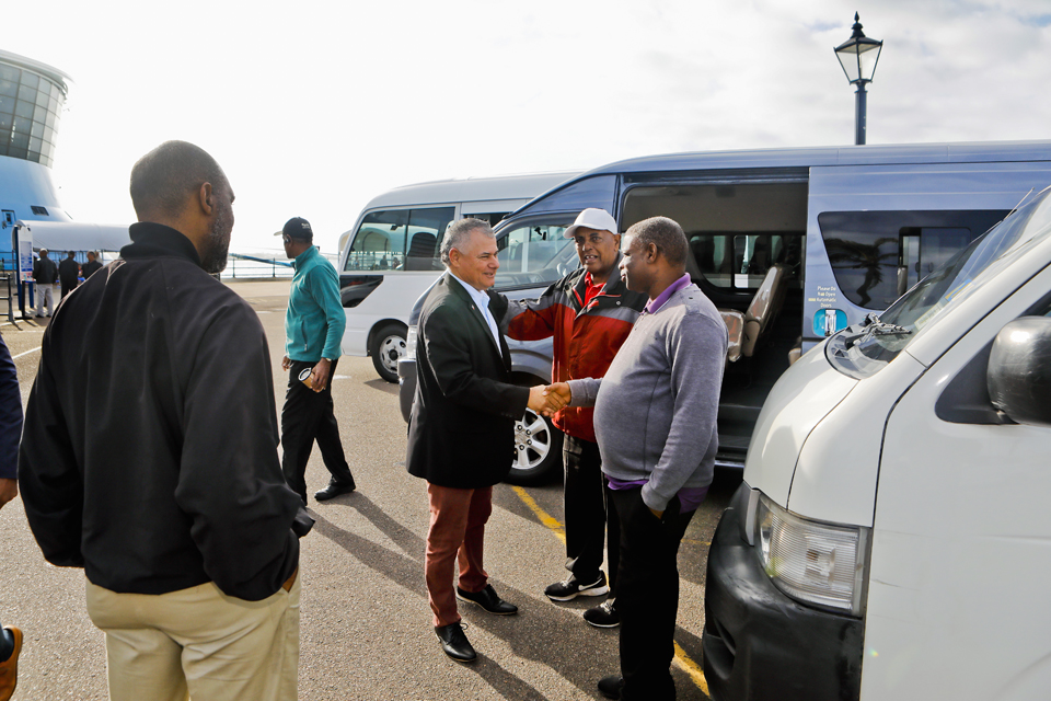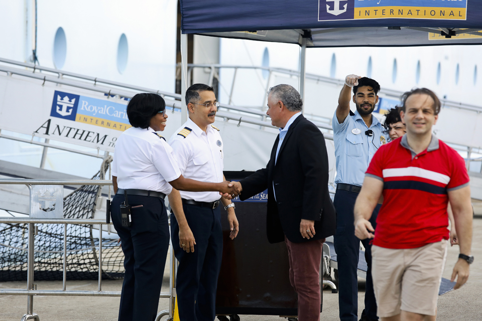 At 4:30 am this morning, the Minister of Tourism and Transport, the Hon. Zane DeSilva JP, MP, travelled to St. Georges and then on to the Royal Caribbean’s Anthem of the Seas’ via pilot boat, where he boarded the vessel and travelled into the Royal Naval Dockyard where the ship is presently at berth.