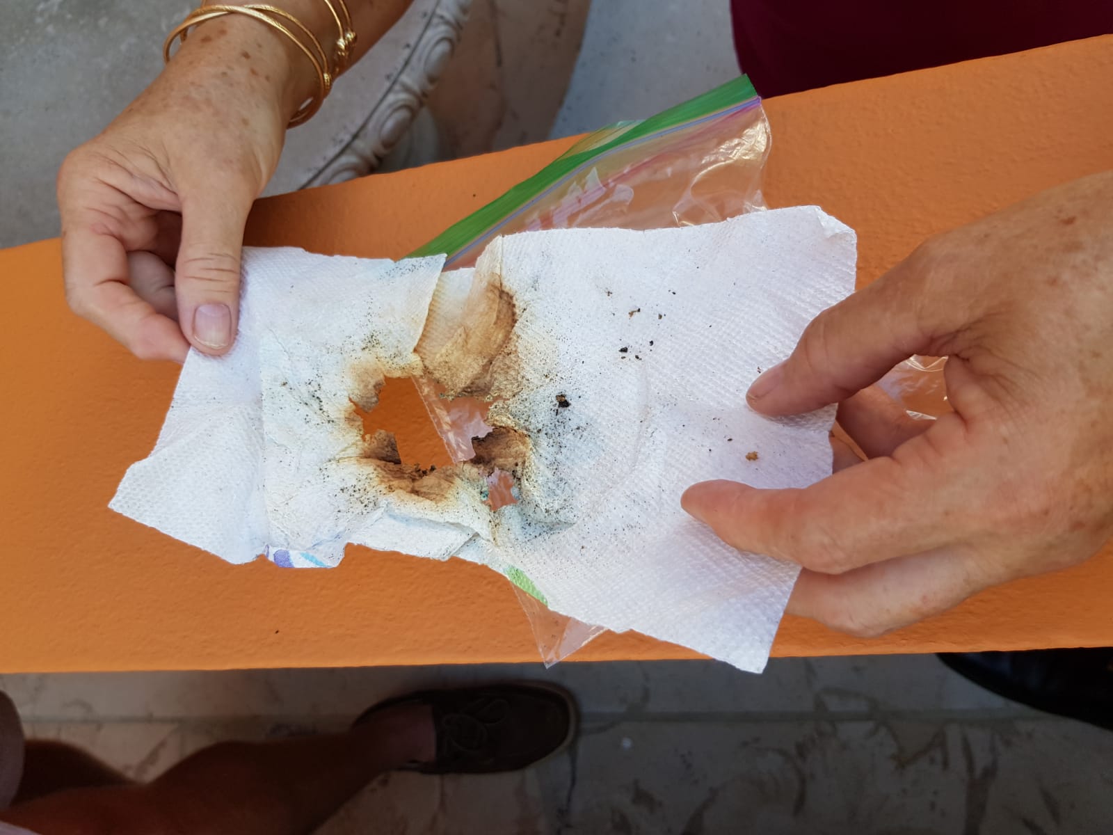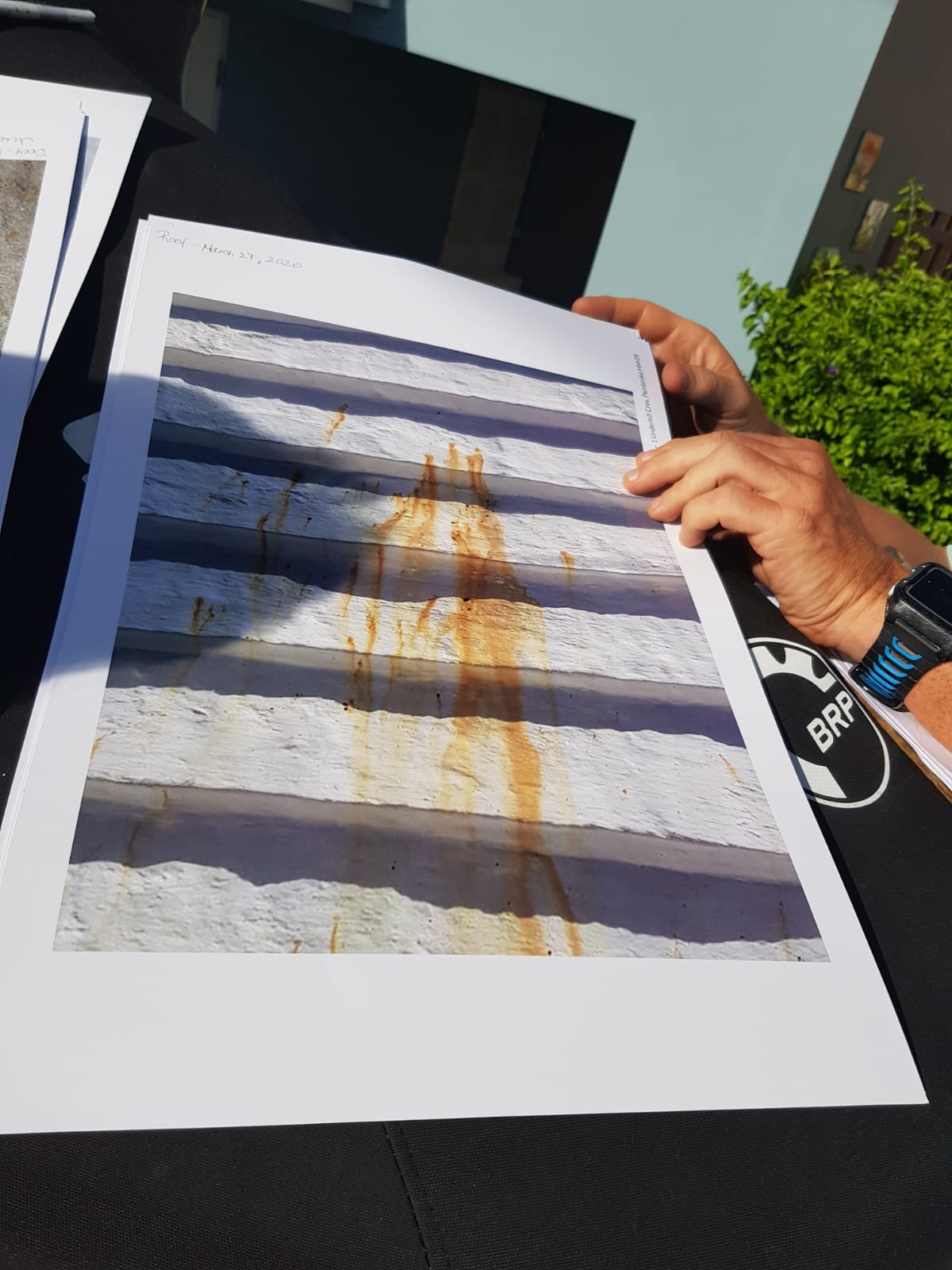 Attached photos: 0001 – Minister Roban meets with a concerned area resident. 0002 – Collected particles emitted from BELCO smokestacks. 0003 – Dr. Geoff Smith with a photo of some soot that had collected in the gutter of a roof of a residential property located on Underhill Crescent. 0004 – Photo of roof discoloration from BELCO emissions. 0006 – Paper towel burnt by collected particles emitted from BELCO smokestacks.