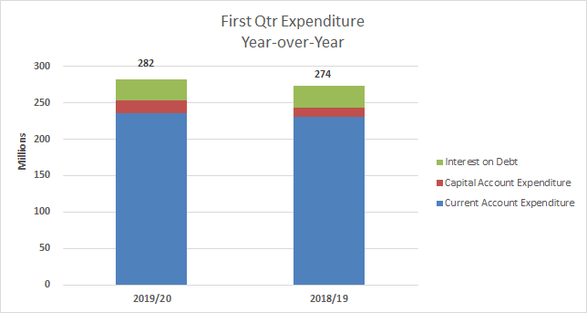 In general, current expenditures, excluding debt service, are presently tracking in line with budget estimates. The $236 million spent in the first three months of 2019/20 represents approximately 25.4% of the total current account budget of $929.9 million.
