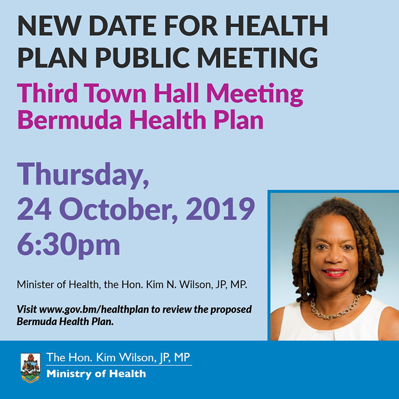 The Ministry of Health is advising that third town hall meeting regarding the proposed Bermuda Health Plan is will be held on Thursday, 24 October at Penno’s Wharf in St George at 6:30 p.m.
