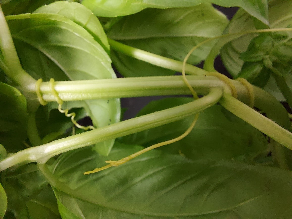 Accompanying the yellowing basil plant was a healthy, vigorously growing dodder plant – which is native to North America and Canada, but widespread throughout the temperate and tropical regions of the world.