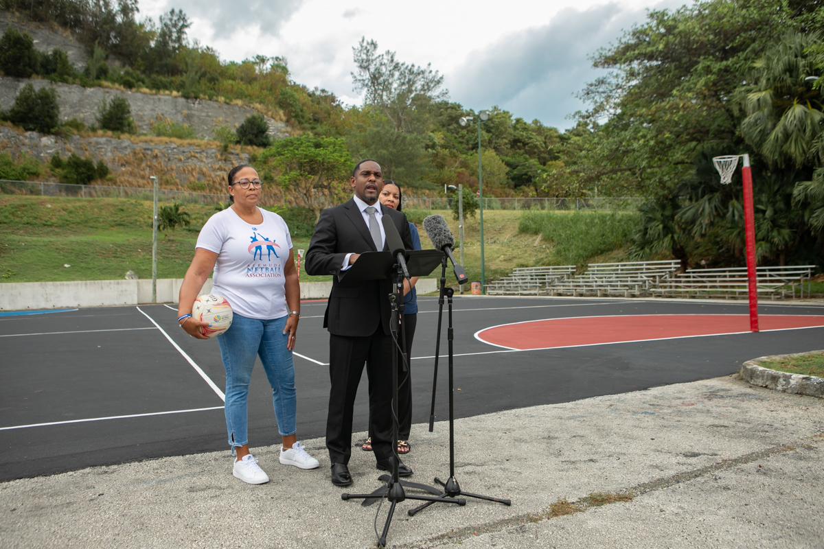 Today, I am honored to be joined by Kimale Evans, President of the Bermuda Netball Association, and Tahkeisha Welch, Secretary of the BNA. It is my distinct pleasure to officially announce the reopening of the Bernard Park Netball Courts after a closure of just over 9 months. This decision was made for health and safety due to the extensive cracks developed in the courts.